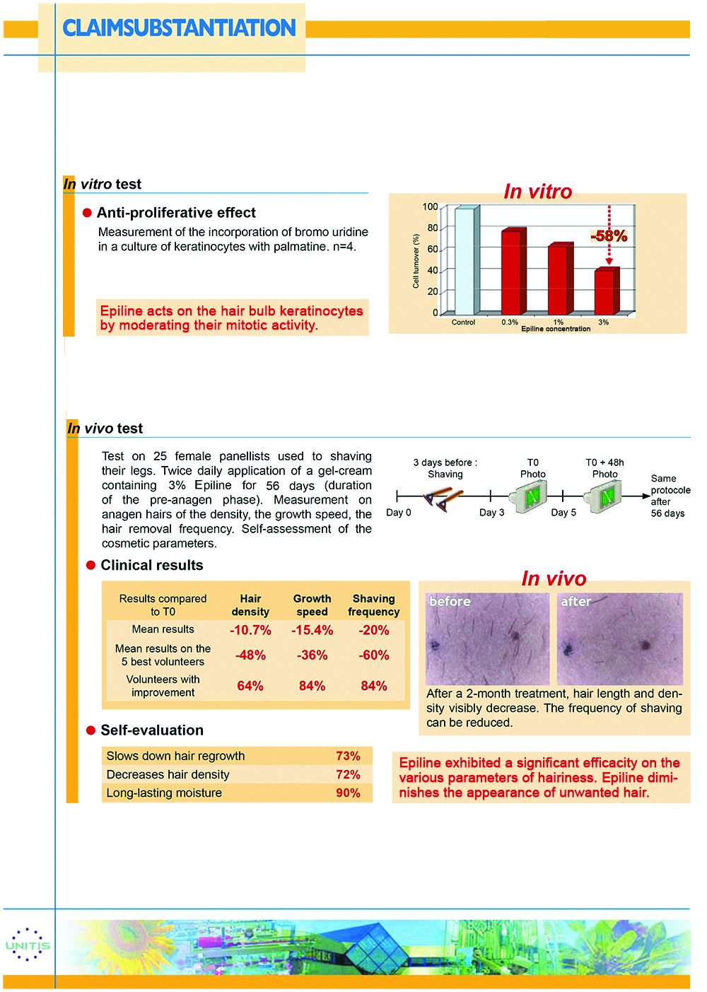 L’Epiline è il prodotto più avanzato dell’industria cosmetica e l’ultima scoperta dei laboratori Sederma della Francia. L’Epiline contiene Palmatina, una sostanza vegetale che blocca la crescita dei peli sul corpo o sul viso.
